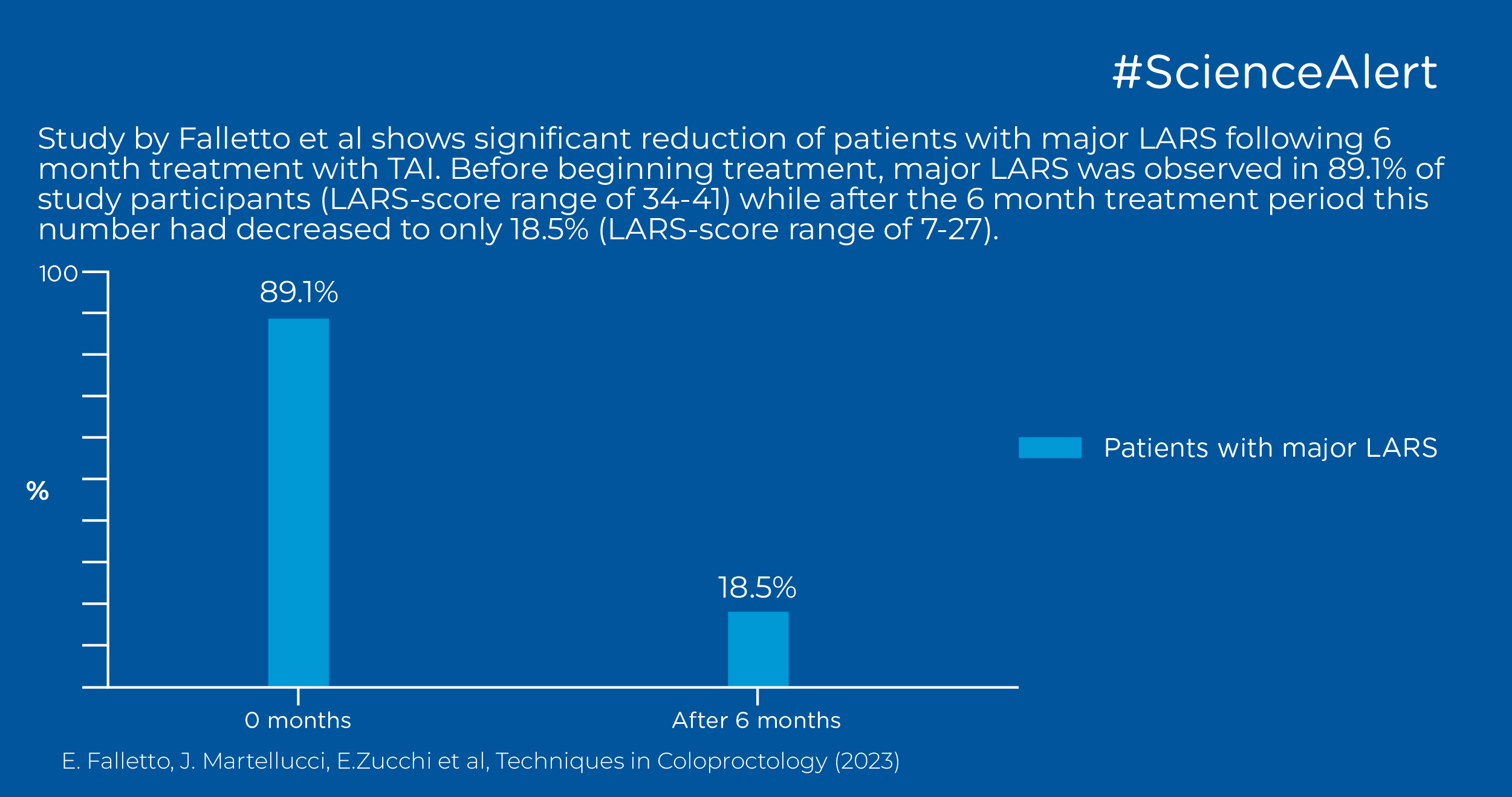 The severity of LARS varies between patients, from major LARS, to minor or no LARS. Prior to treatment with TAI, major LARS was observed in 89.1% of study participants (LARS-score range of 34-41) while after the 6 month treatment period this number had decreased to only 18.5% (LARS-score range of 7-27). The results in this study by Falletto et al are consistent with previous literature, such as in similar studies by Martellucci et al. and Enriquez-Navascues et al. who observed a drop of the disorder severity score from major LARS to no LARS, reporting median LARS score from pre-treatment values of 35.1 (range 30–42) and 35.0 (range 32–39) to post-treatment values of 12.2 (range 0–21) and 12.0 (range 12– 26), respectively.