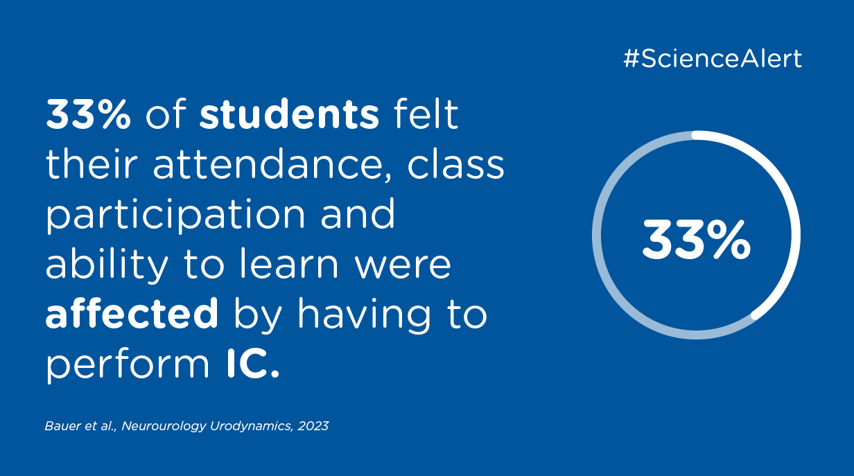 A new study from 2023 by Bauer et al. finally provides insights into that. The study examines what adolescents, young adults and their caregivers experienced when IC was required during the school day, and how well the schools adjusted to their needs, e.g., by enabling privacy, adequate hygiene, and appropriate access to bathroom facilities. Schoolchildren and adolescent typically spend eight hours or more of the day in a school setting, that's why it’s important to be able to catheterise in an adequate way when needed and not risk missing out on important educational and social school activities.